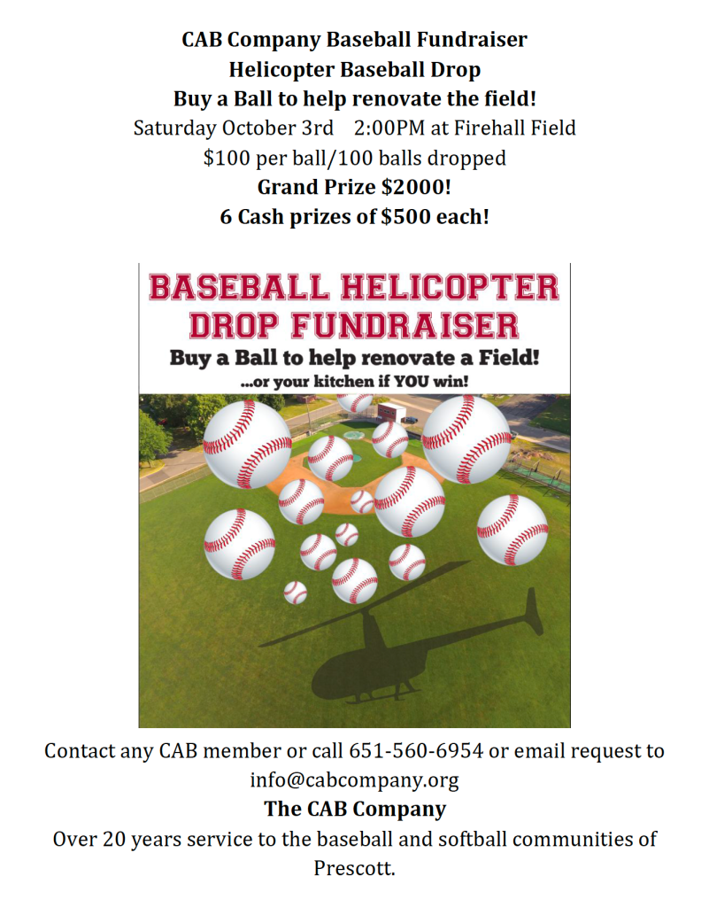The CAB Company will be hosting their annual Helicopter Ball-Drop on October 3rd at 2:00PM, at Firehall Field! Only 100 balls will be sold this year, and will be sold quick! If you’d like to reserve a ball(s) for yourself or others, please reach out to a member of the CAB Company as soon as you can! Additional information is provided in the attachment below.